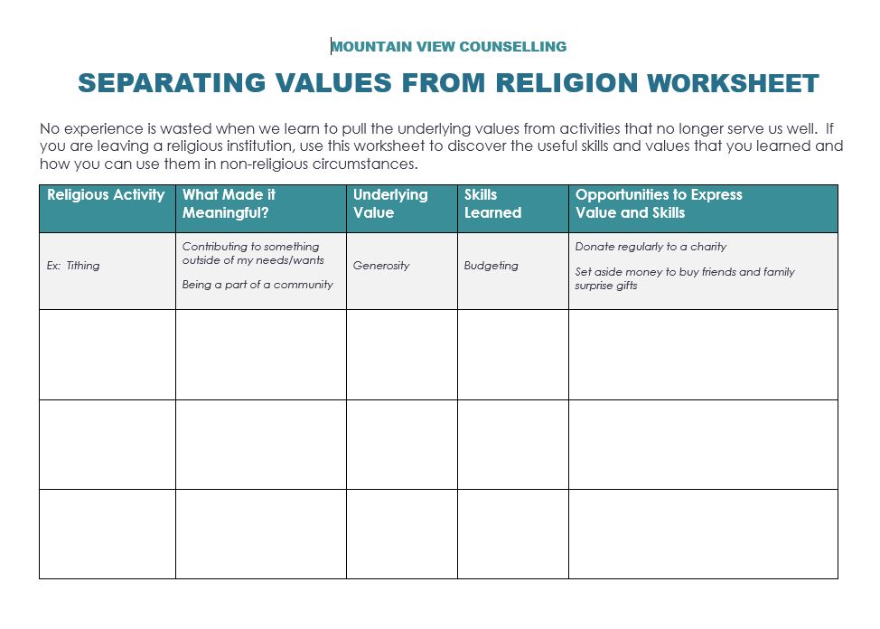 No experience is wasted when we learn to pull the underlying values from activities that no longer serve us well. If you are leaving a religious institution, use this worksheet to discover the useful skills and values that you learned and how you can use them in non-religious circumstances.